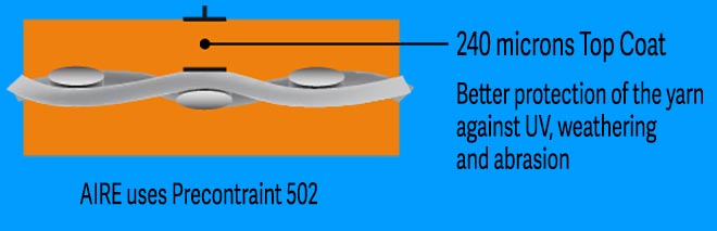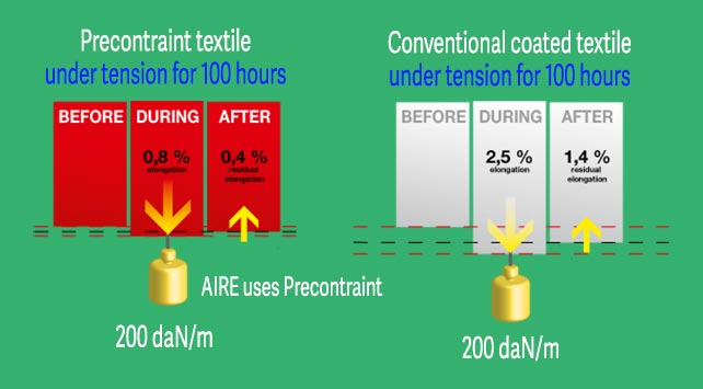 There is one website, for an American company engaged in building large structural covers, that might leave you with the impression that the "pre-contraint" adjective has to do with the thin acrylic coating applied to the outer surface of Ferrari's pvc, but this is not the case. The acrylic topcoat can make the material easier to weld with certain types of equipment, and makes for a surface that is shinier, prettier, easier to clean, and somewhat more resistant to both uv and abrasion, but it has nothing to do with the "precontraint" moniker.